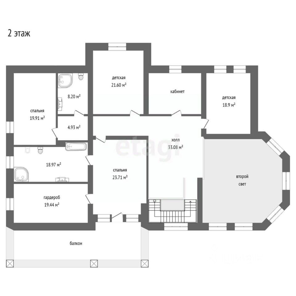 2-й этаж: спальня гостевая, ванная детская и гостевая, ванная 2, гардероб, детская 1, детская 2, спальня родителей, кабинет, холл, балкон.