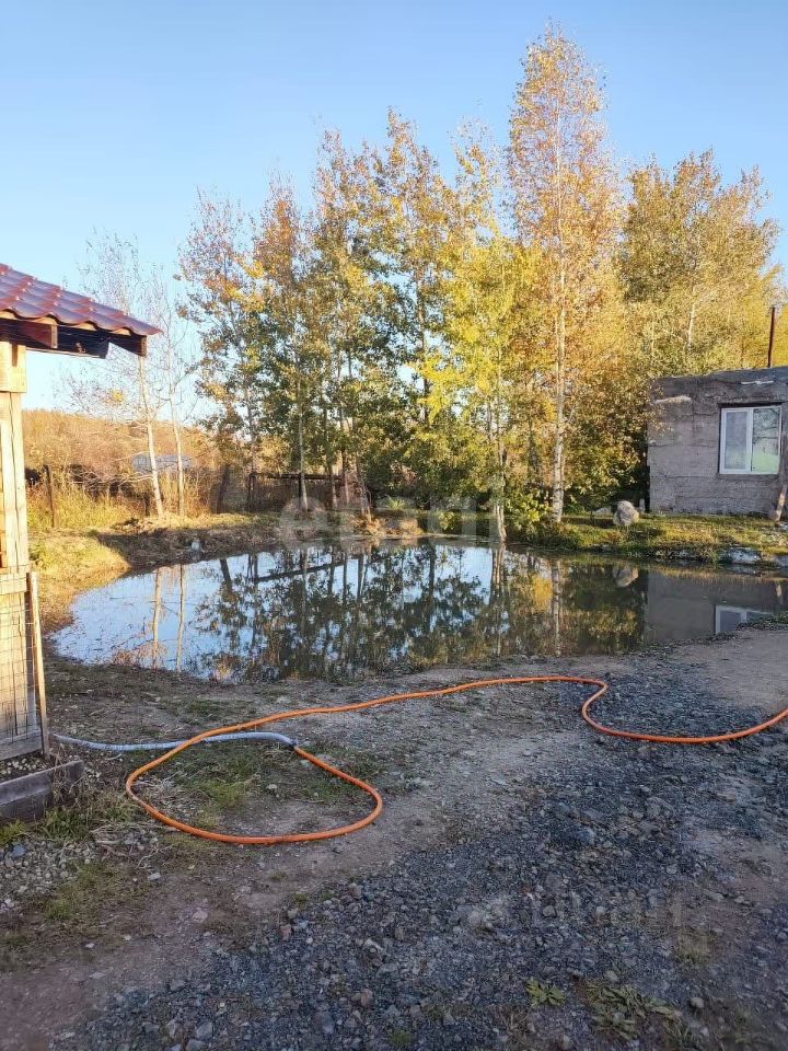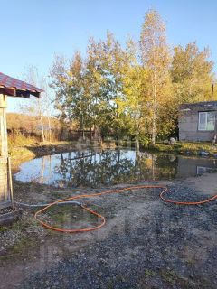 На участке выкопан водоем. Есть беседка и хозяйственные постройки. Асфальтная дорога к дому.