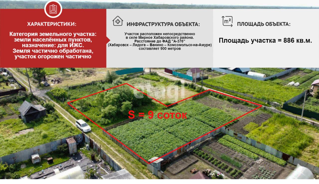 У вас есть уникальная возможность стать счастливым обладателем земельного участка в живописном районе села Мирное Хабаровского района! Площадь участка - 9 соток, что позволит вам реализовать любые свои строительные и дизайнерские задумки. Земельный участок идеально подойдёт для строительства вашего собственного уютного дома или загородной виллы. Рядом с участком проходят грунтовые подъездные пути, что обеспечит вам удобный доступ к вашему будущему дому. Рядом с участком уже установлен электрический столб, что значительно упростит подключение к электроснабжению. Все документы на оформлены в полном объеме, что гарантирует вам безопасную и прозрачную сделку. Мы предоставляем полное юридическое и личное сопровождение, помощь в одобрении ипотеки, а также гарантированно выдаем "ГАРАНТИЙНЫЙ СЕРТИФИКАТ" при сделках до 10 млн. рублей. Не упустите свой шанс приобрести эти уникальные участки и построить свой долгожданный дом в живописном месте! Звоните прямо сейчас, и я, Константин Кортелев, отвечу на все ваши вопросы и помогу вам осуществить вашу мечту о собственном жилье!