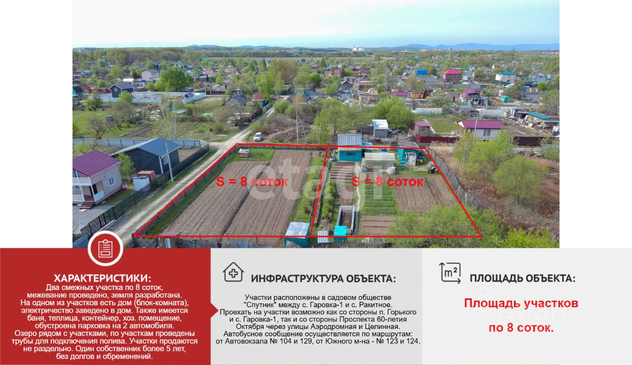 Компания Этажи предлагает к покупке 2 смежных участка общей площадью 16 соток, каждый по 8 соток. На обоих участках проведено межевание, земля разработана. Есть всё для жизни и хорошего отдыха. На одном из участков расположен небольшой дом-блок комната, обшита деревом, пристроена кухня, чердак, парковка на 2 машины. Есть баня небольшая, на 4х человек, но очень уютная, мягкий пар. Электричество протянуто в домик и баню, есть дополнительный вывод под генератор. Остается бытовая техника холодильник, чайник, микроволновка. На участке имеется теплица, парник, контейнер, летний туалет, мангал, песочница, качеля. Остается инвентарь: мотоблок с навесным оборудованием, "каскад" с двигателем ямаха, триммер хускварна, мотопомпа, дрова и пиломатериалы. При желании можно строить все что угодно. Участок разработан, посадки деревьев и кустарников, виноград, малина, клубника, жимолость, смородина, вишня, слива, яблоня.