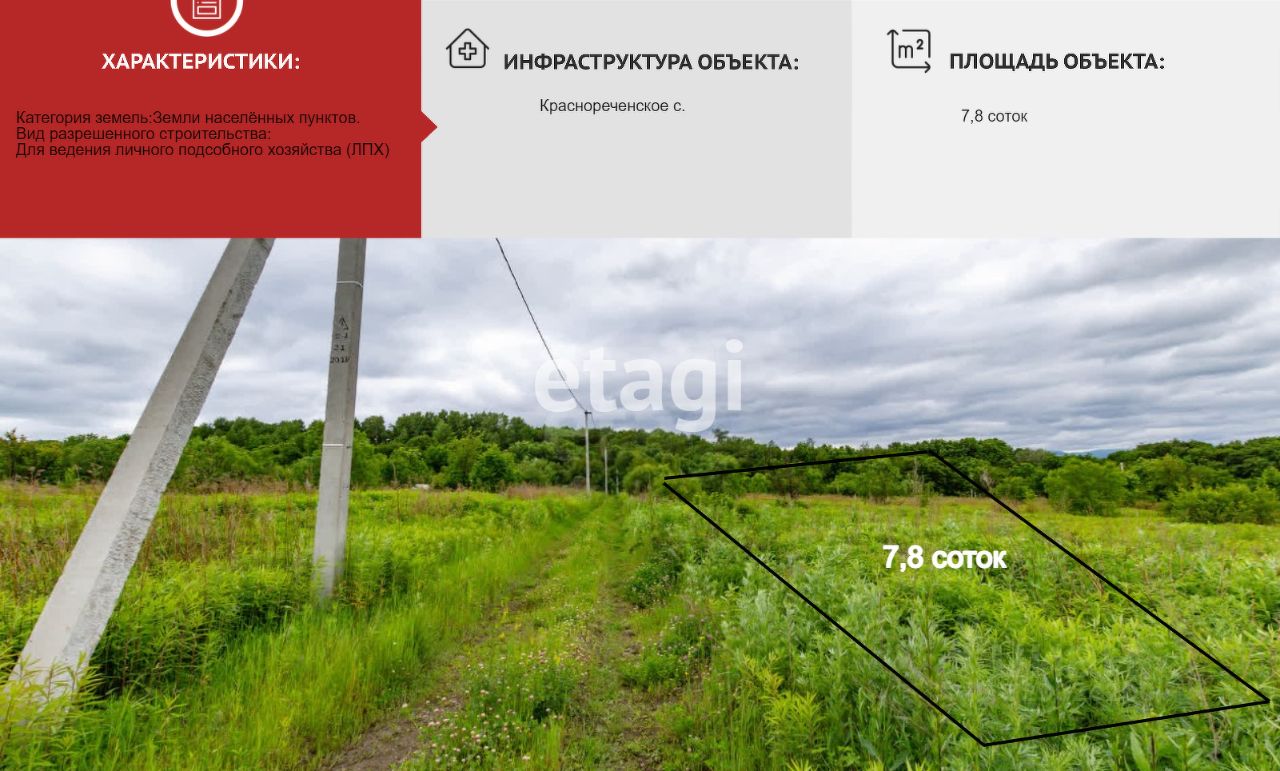Продается уникальный участок общей площадью 7,8 сотки в с. Краснореченское, который идеально подойдет для строительства вашего дома мечты! Обратите внимание, это предложение особенно привлекательным для тех, кто ищет простор и возможность реализовать свои идеи. Участок расположен вдали от городского шума и суеты, что обеспечит вам тишину и умиротворение. Межевание на участке есть, что избавит вас от лишних забот. В непосредственной близости, всего в 5 минутах пешком, находятся магазины. В 5мин. езды на машине находятся дет.сады, школы. что сделает вашу жизнь комфортной и удобной. Рядом с участком установлен столб, что позволит вам быстро начать строительство. Вокруг уже строятся соседи, что создает дружелюбную атмосферу и возможность завести хорошие знакомства. Чистая продажа. Звоните прямо сейчас и запишитесь на просмотр!Здесь вы сможете не только построить дом своей мечты, но и создать пространство для семейных встреч, активного отдыха и уединения. Не упустите шанс стать владельцем этого замечательного участка!