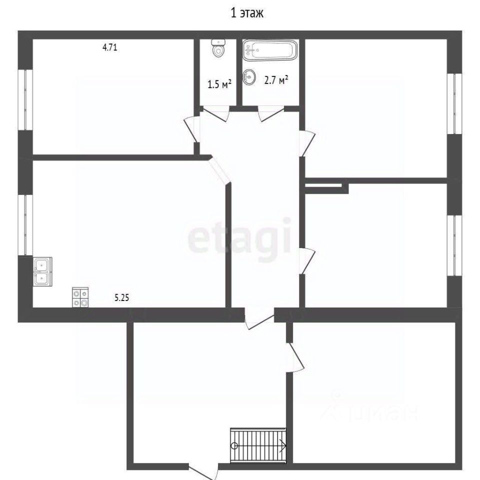 На первом этаже расположены кухня-гостиная, три комнаты, раздельный санузел и просторный подвал 15 кв. м.