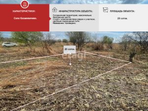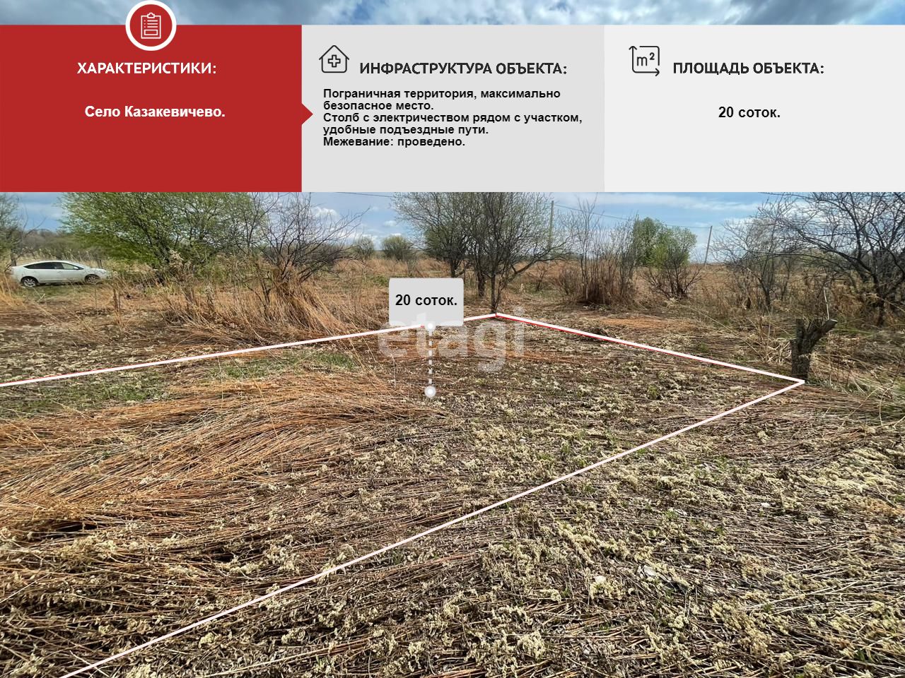 Продам земельный участок 20 сотки в селе Казакевичево, пограничная территория, максимально безопасное место. Участок в собственности. Категория земель: Земли населенных пунктов. Электричество рядом столб, удобные подъездные пути. Межевание: проведено. Один взрослый собственник! Поможем с постройкой ДОМА можно в ипотеку. Консультация и одобрение ипотеки. Звоните, пишите, приезжайте смотрите и приобретайте. Все документы готовы к быстрой продаже. Звоните, Елена.