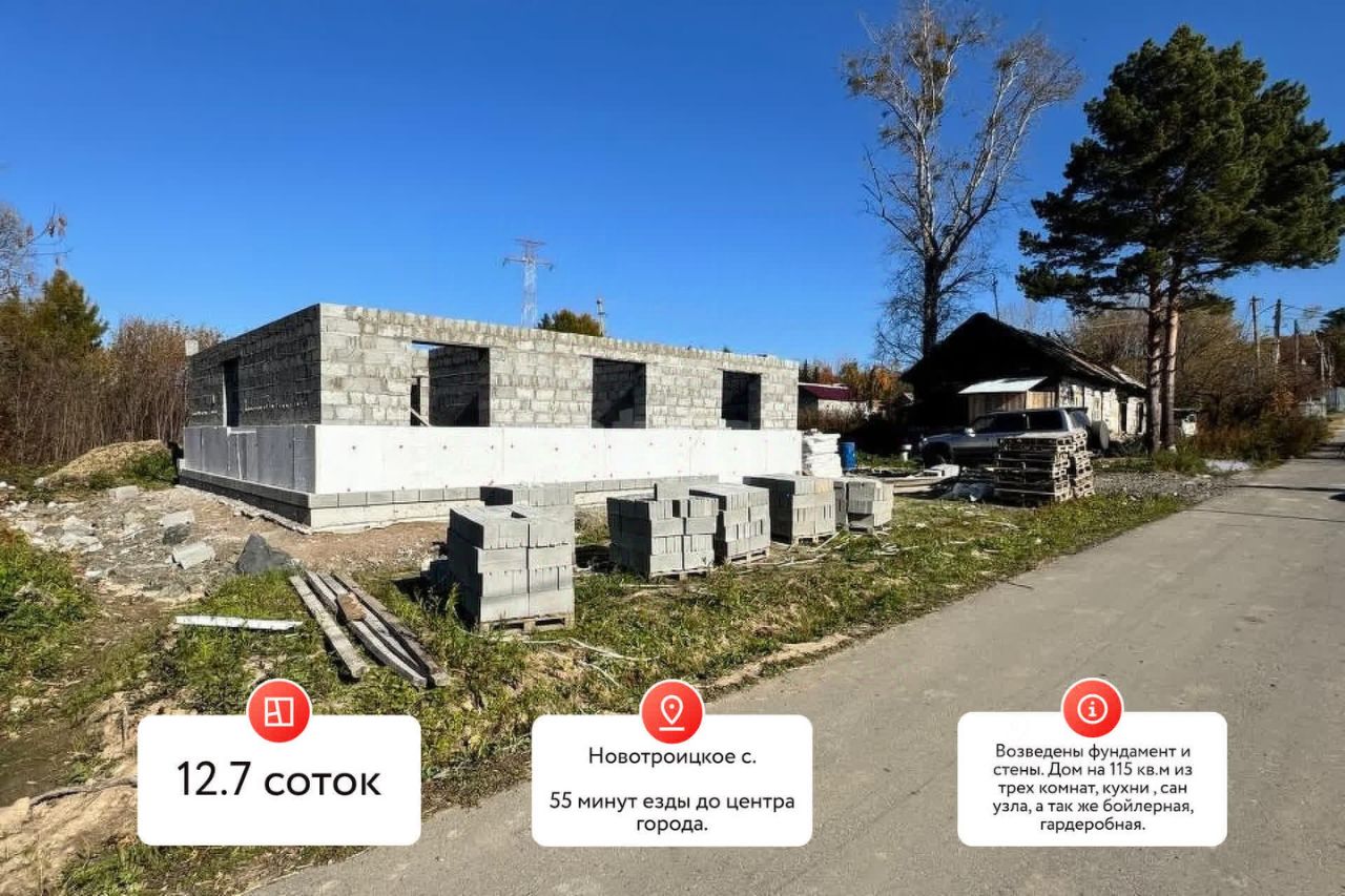 В продаже появился прекрасный участок со строящемся на нем жилом доме. Возведены фундамент и стены. Дом на 115 кв.м из трех комнат, кухни , сан узла, а так же бойлерная, гардеробная. Шамбо и скважина ждут своего подключения. По окончанию строительства планируются теплые полы, оштукатуренные стены, кафель в санузле, эл.проводка разведена. Предполагается возведение забора.На фотографиях отображены все этапы строительства дома. Все внутренние работы застройщик может выполнить по вашему усмотрению. Объект расположен в очень удобном месте, рядом вся необходимая инфраструктура, школа, детский сад ,магазины, аптеки и др. Дом подходит под все виды льготных ипотек.