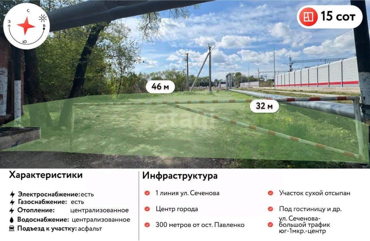 Участок площадью 15 соток расположен на пересечении улиц Сеченова и Карла-Маркса — ключевых транспортных артерий города, обеспечивающих высокую проходимость. Местоположение сочетает преимущества оживленной магистрали и развитой инфраструктуры: ежедневный трафик включает как транзитный транспорт, так и целевых посетителей близлежащих учреждений. Улица Сеченова служит альтернативным маршрутом для грузового и легкового транспорта, минующего центр города, что гарантирует стабильный поток потенциальных клиентов. Район характеризуется активной застройкой: помимо существующих жилых комплексов и административных зданий (таможня, служба судебных приставов) в радиусе 500 метров ведется возведение новых коммерческих и жилых объектов. В пешей доступности расположен ТЦ "Большая Медведица" с кинотеатром, гипермаркет "ЭНКА-мебель", остановка общественного транспорта "Павленко" и удобный выезд на улицу Карла-Маркса. Такая локация оптимальна для бизнеса, ориентированного на жителей микрорайона и транзитных посетителей: кафе, магазина формата "у дома", автосервиса или предприятия сферы услуг. Участок имеет правильную форму, проведено межевание, границы согласованы. Угловое расположение обеспечивает дополнительную видимость для рекламы и удобный подъезд с двух сторон. Территория свободна от построек, что позволяет реализовать любой проект без необходимости демонтажа. Учитывая динамику развития района и транспортную нагрузку, объект представляет собой перспективную инвестицию с потенциалом роста стоимости. Продажа осуществляется напрямую собственником, готовы предоставить полный пакет документов и организовать осмотр. Для уточнения деталей и согласования встречи свяжитесь по указанному телефону. Код пользователя: 180117 Номер в базе: 8659865