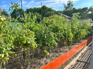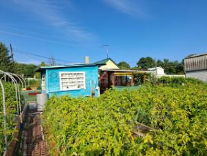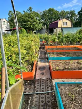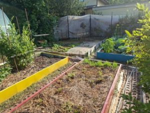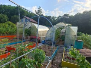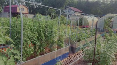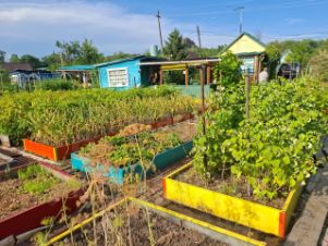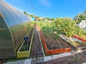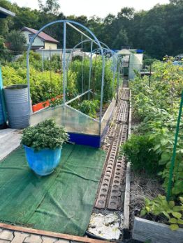 две теплицы, два парника, множество плодово-ягодных кустарников и деревьев.