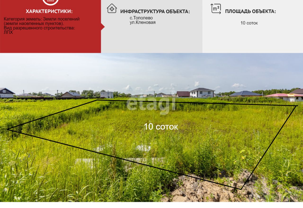 Земельный участок площадью 10 соток с установленными границами находится в селе Тополево на улице Кленовой.