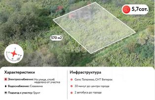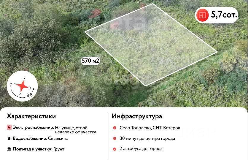 Продается участок 5,7 соток, Тополевское сельское поселение, с. Тополево, СНТ Ветерок. 25 минут от центра города. Кадастровый номер 2. Около СНТ - остановка общественного транспорта.