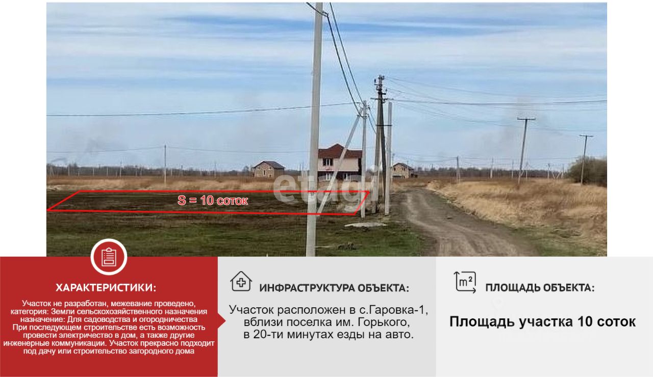 Компания "ЭТАЖИ" предлагает к покупке земельный участок площадью 10 соток. Отличное расположение, находится в с.Гаровка-1, вблизи поселка им. Горького, 20 минут езды на автомобиле. Участок расположен недалеко от дороги. При последующем строительстве есть возможность провести электричество в дом, а также другие инженерные коммуникации. Проведено межевание. Участок прекрасно подходит под дачу или строительство загородного дома.