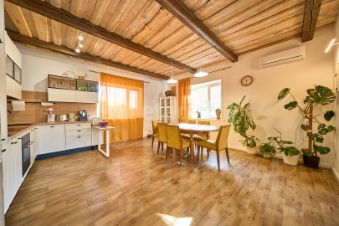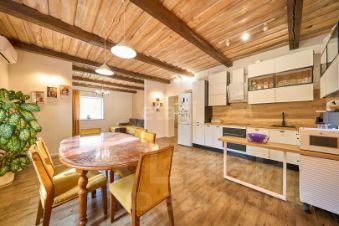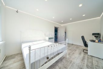 В доме установлена современная кухня с австралийскими доводчиками, мебель выполнена из массива, межкомнатные двери отличаются высоким качеством и выполнены из шпона. Сантехника также премиум-класса, с инсталляцией Grohe. Предусмотрены два санузла и отдельная ванная комната. На первом этаже расположена котельная. Стены окрашены, что позволяет при желании обновить их с помощью покраски или обоев. Полы первого этажа выполнены из керамогранита, а потолок с декоративными балками смотрится очень привлекательно; на втором этаже установлен натяжной потолок.