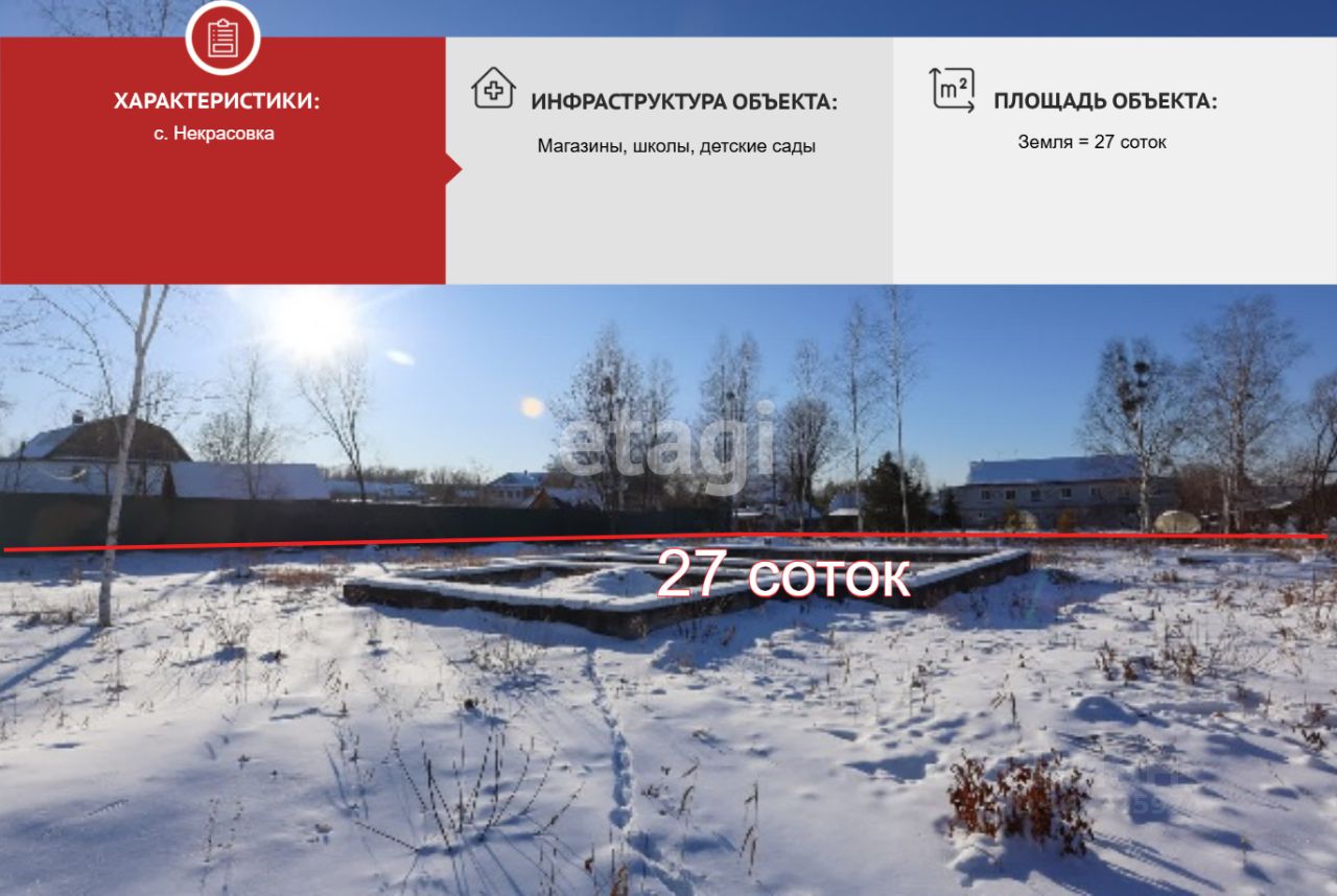 Предлагается к продаже отличный земельный участок 27 соток, подходящий под индивидуальное жилищное строительство в селе Некрасовка. Есть межевание. Участок ровный, вода не застаивается, не топит, сухой, хорошо освещён со всех сторон солнцем. Хорошие подъездные пути. Этот динамично развивающийся район станет отличным местом для летнего отдыха или для постоянного места жительства, ведь здесь уже есть 2 детских сада, 2 школы, множество продуктовых магазинов в шаговой доступности и больница. Красивая природа, доброжелательные соседи. Плодородная земля. Приобретение такого участка - это прекрасная возможность для постройки дома и сбора урожая в будущем. Документы все подготовлены к продаже. Помогу в выборе строительной организации. Звоните, с радостью отвечу на все Ваши вопросы.