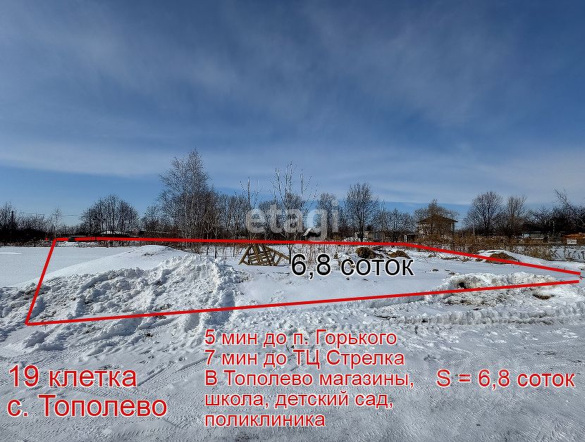 Продается отличный участок для строительства загородного дома. Рядом с. Тополево и с. Мирное. Район быстро застраивается. От Хабаровска 10 мин, до Горького 5 мин. До ТЦ "Стрелка" 7 мин. Участок ровный прямоугольной формы, сухой, вне зоны подтопления. Площадь 6,8 соток. Документы в порядке: Участок в собственности (собственник 1) Преимущества: Сельская прописка - это скидки на оплату налогов и коммунальные услуги, льготная ипотека на строительство дома. Льготные программы: (2-6%) ДВ ипотека, семейная. Обращайтесь! Обсудим способы приобретения. Подберу надежную подрядную организацию и проект загородного дома. Звоните и не упустите свой шанс построить дом мечты!!!