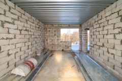 Фундамент - сваи на глубине 3 метра, лента на песчаной подушке, гидроизолирована и укрыта песком. Предусмотрен теплый погреб.