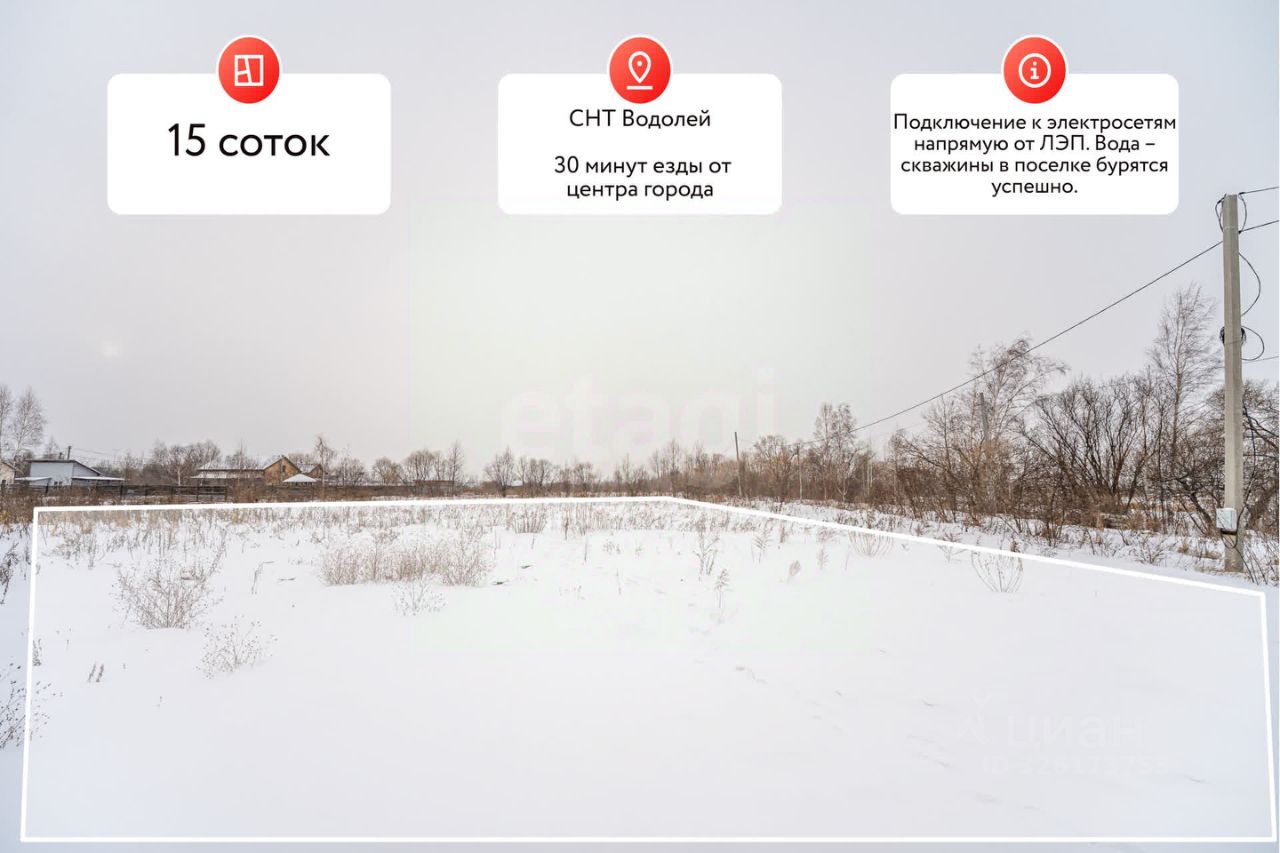 Предлагаем идеальный участок. Ровный, прямоугольный участок 15 соток в СНТ "Водолей", всего в 5 минутах езды от поселка Горького. Забудьте о пробках 12 минут, и вы на проспекте 60 лет Октября!