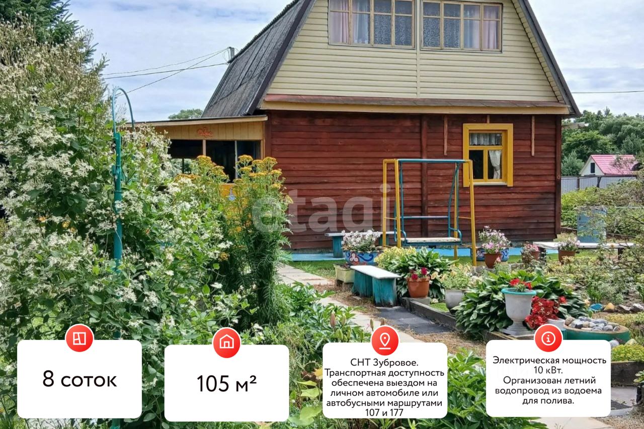 В СНТ "Зубровое" (Корсаково-2) предлагается к продаже ухоженная дача на охраняемой территории. Ключевой актив — капитальный двухэтажный дом площадью 105 кв.м. на ленточном фундаменте. Конструктив отличается надежностью: стены из бруса 180х180 мм, утепление пола и потолка первого этажа, наружная обшивка из лиственницы с противопожарной пропиткой. К дому примыкает просторная веранда. На участке в 8 соток расположен второй гостевой дом площадью 26,25 кв.м., что создает потенциал для размещения большой семьи или отдельного кабинета. Инфраструктура участка полностью подготовлена для комфортного проживания: летняя беседка, теплица, летний душ с подогревом, парковка на два автомобиля. Организован летний водопровод из водоема для полива, имеется садовый инвентарь и техника, включая мотокультиватор и электрокосилку, которые остаются новому владельцу. Участок плодородный, с ягодными насаждениями — клубникой, жимолостью, смородиной, малиной. Электрическая мощность 10 кВт обеспечивает работу всей бытовой техники, включая кондиционер и электроплиту, которые также входят в стоимость. Два водоема в шаговой доступности расширяют возможности для отдыха. Транспортная доступность обеспечена выездом на личном автомобиле или регулярными автобусными маршрутами 107 и 177. Все строения поставлены на кадастровый учет, документы готовы к сделке. Объект представляет собой готовое решение для круглогодичного загородного проживания без необходимости дополнительных вложений.