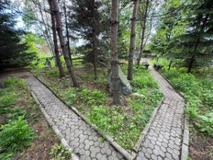 Во дворе дома насаждения из Еловых деревьев. Тропинки выложены брусчаткой. В вечернее время можно включить подсветку и наслаждаться романтикой.