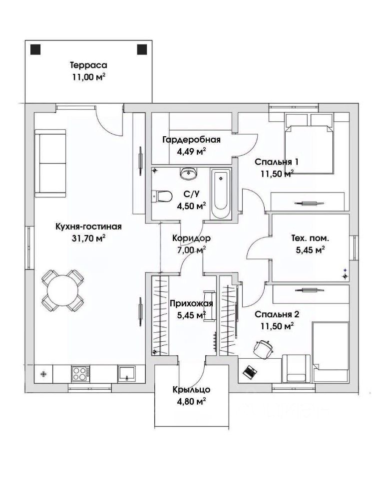 Планировка: 2 просторные спальни (одна с собственной гардеробной), светлый санузел, практичное техпомещение и большая кухня-гостиная 31.7 кв.м. с выходом на собственную террасу.
