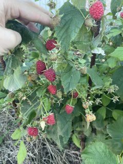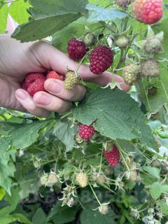 Часть участка облагорожена насаждениями, высажены ягодные культуры (3 вида вишни, два вида жимолости, сортовая клубника и много кустов дорогих сортов малины, которая уже активно плодоносит)