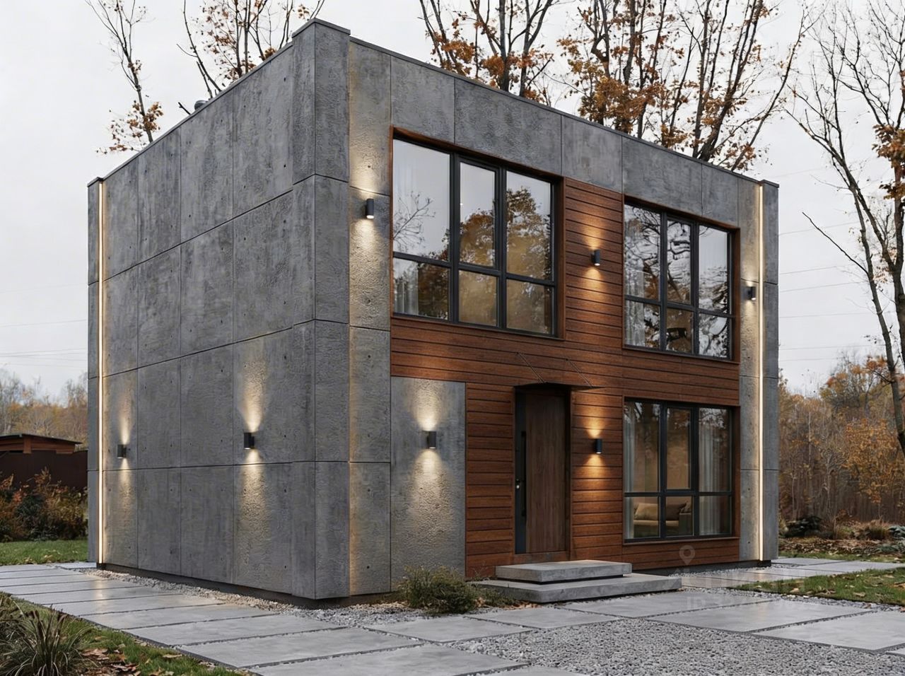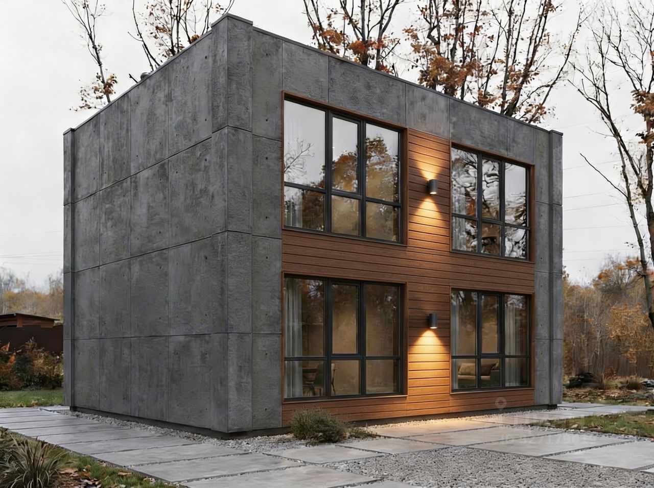 — Стены: трёхслойные панели (бетон + утеплитель + бетон) — тепло, тишина, долговечность;