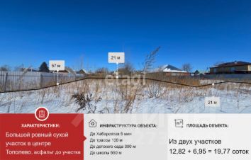Продается земельный участок площадью 12,82 сотки в поселке Тополево, предлагаемый как отдельно, так и в комплекте с соседним участком, что в сумме составляет 19,77 соток. Объект расположен в центральной части обжитого района с завершенным коттеджным строительством и сложившейся социальной инфраструктурой. Подъезд к участку осуществляется по асфальтированной дороге, расстояние до федеральной трассы — всего 100 метров, что обеспечивает быструю транспортную доступность. Дорога до центра Хабаровска занимает порядка 15 минут, что является оптимальным решением для тех, кто ценит спокойствие загородной жизни, но нуждается в регулярных поездках в город. В шаговой доступности расположены детский сад (300 метров) и школа (550 метров). Участок предоставляет полную свободу для реализации индивидуального проекта жилого дома с учетом потребностей будущих владельцев. Все необходимые коммуникации подведены по границе территории. Наличие смежного участка в собственности открывает дополнительные возможности для планирования масштабного строительства или сохранения приватности. По вопросам просмотра и приобретения обращайтесь к специалисту по загородной недвижимости. Идентификаторы объектов в базе: #11859649 и #11859757.