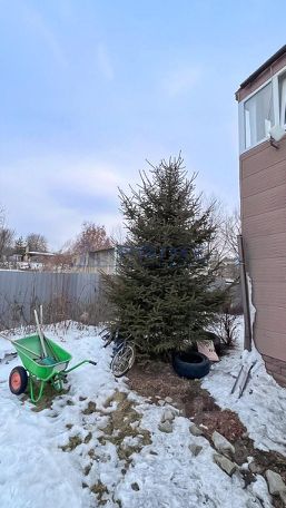 Декоративные растения: большая ель у входа, голубая ель во дворе, сакура и багульник.