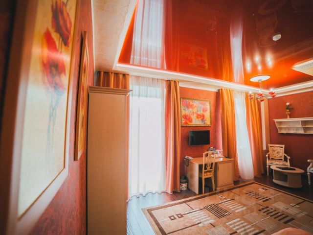 В номере: двуспальная кровать, диван-кровать, туалетные принадлежности, фен, тапочки, телевизор, кондиционер, холодильник, шкаф, вешалка, стол, стулья, тумбочки прикроватные, комод для белья, зеркало, полотенце, чайник, часы настенные, настольная лампа, посуда (чайные пары, стаканы, рюмки)