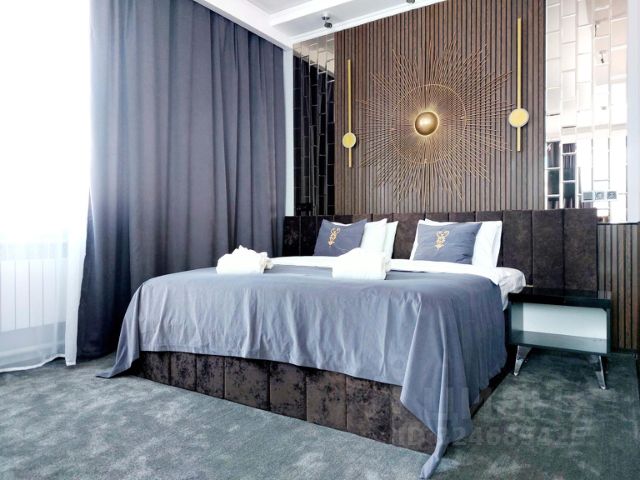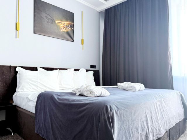 В номере: двуспальная кровать, диван-кровать, туалетные принадлежности, фен, тапочки, телевизор, кондиционер, холодильник, шкаф, вешалка, стол, стулья, тумбочки прикроватные, комод для белья, зеркало, полотенце, чайник, часы настенные, настольная лампа, посуда (чайные пары, стаканы, рюмки)